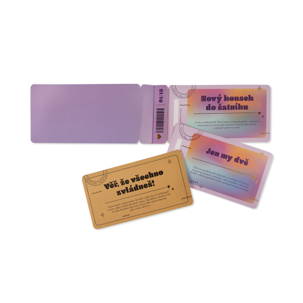 Každý z 15 kuponů přináší jeden drobný nápad na chvíli, kterou můžete prožít společně – lenivý den v pyžamu, společný výběr nového kousku do šatníku nebo třeba prodloužená večerka.