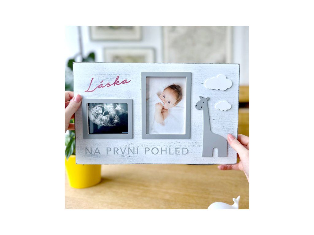 Velký fotorámeček je ideální způsob, jak zachytit a uchovat nejcennější okamžiky vašeho děťátka. Díky designu s prostorem na dvě fotografie můžete spojit například fotografii z ultrazvuku a první portrét miminka do jedné kouzelné dekorace. Jemný dřevěný efekt, nápis „Láska na první pohled“ a roztomilá 3D žirafa dodávají rámečku jedinečné kouzlo. Lze jej snadno umístit na poličku, stůl nebo zavěsit na zeď.