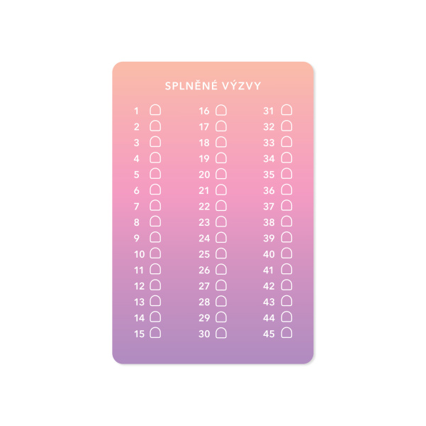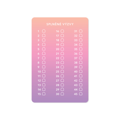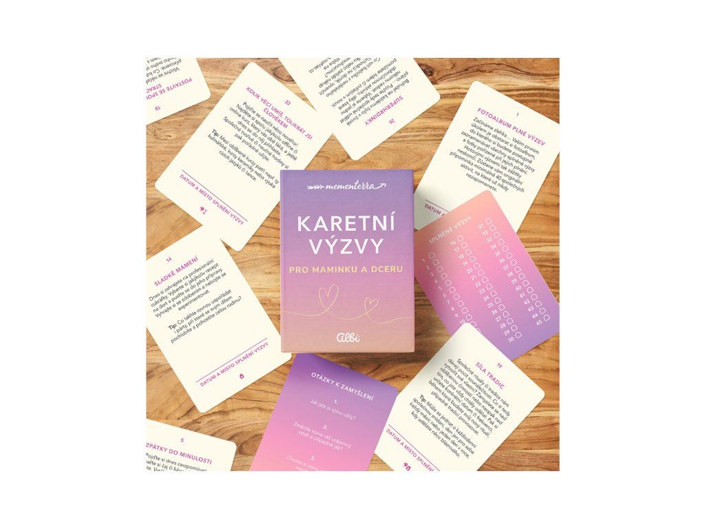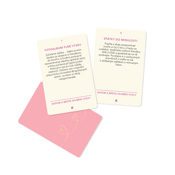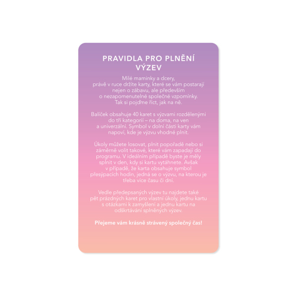 Vedle předepsaných výzev v balíčku najdete také 5 prázdných karet pro vaše osobní výzvy a 1 kartu s otázkami k zamyšlení, na které si zkusíte odpovědět po každém splnění výzvy. Aby se vám v (ne)splněných výzvách lépe orientovalo, přidali jsme kartu na odškrtávání hotových úkolů. Pro správné naladění tu zase najdete karty s tematickým citátem – jednu pro maminku a druhou pro dceru.