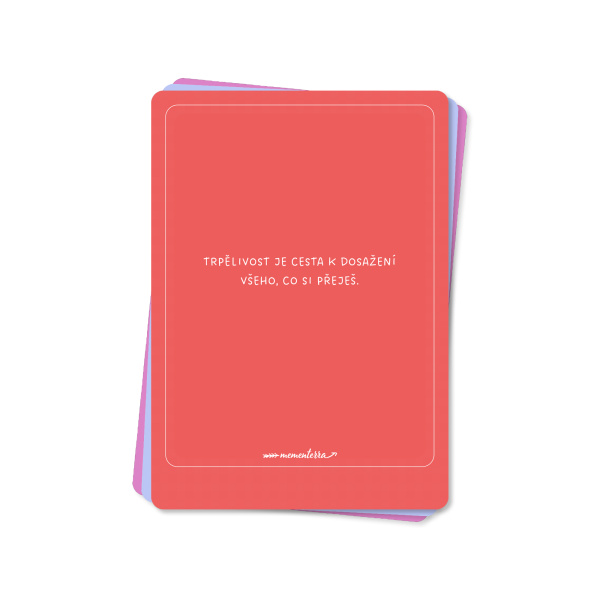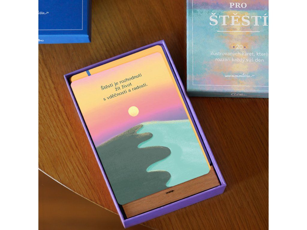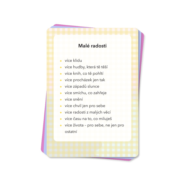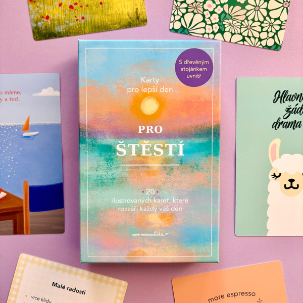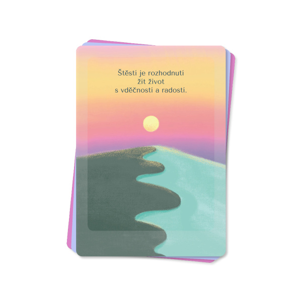 Sada 20 ilustrovaných karet vám vnese do života povzbuzení i nadhled, který v každodenním shonu tak snadno ztrácíme. Pomohou vám zpomalit, naladit se na pozitivní vlnu a znovu si uvědomit, že štěstí máte často přímo před očima. Každá karta je oboustranná – na přední straně hezký motiv, na zadní malý vzkaz jen pro vás. Karty libovolně střídejte podle nálady nebo dne.