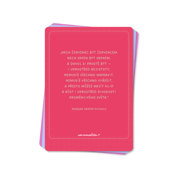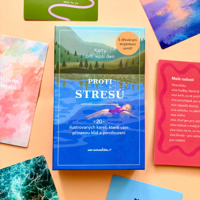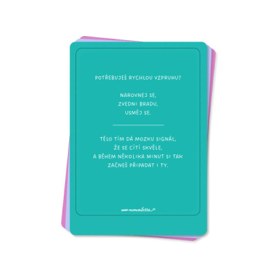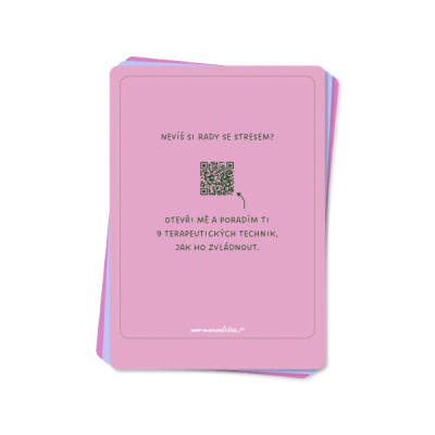 Práce se stresem není jen o náročných technikách či meditaci, ale i o radosti z maličkostí všedního dne. A tuhle radost jsme se vám snažili navodit pomocí zadních stran karet. Čeká vás na nich hned několik překvapení. Ať už se díky speciálně sestaveným playlistům ocitnete uprostřed šumějícího lesa nebo se pomocí uvedených afirmací dostanete k vytouženým cílům, věříme, že vám bude tahle sada relaxačních karet skvělým parťákem a oporou.