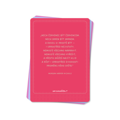 Na pracovním stole, na lednici nebo v diáři – tato sada 20 karet s jemnými ilustracemi a fotografiemi vám promění jakékoliv zákoutí domova či kanceláře v zenový koutek. Kartičky jsou vytvořené tak, aby měly co nejvíce využití – nejen jako dekorace, ale také jako antistresová pomůcka nebo jako součást vašeho vision boardu.