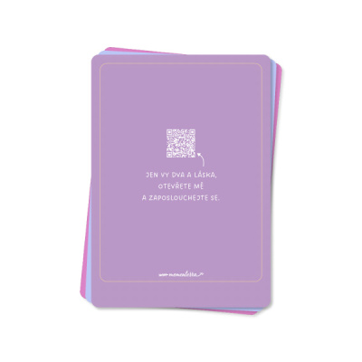 Láska je nejen o srdíčkách a velkých slovech, ale především o nezaměnitelném pocitu bezpečí a propojení. A ten jsme se vám snažili navodit pomocí zadních stran karet, na kterých vás čeká hned několik překvapení. Ať už se díky sestaveným playlistům naladíte na tu správnou atmosféru nebo se společně pustíte do plnění párových výzev, věříme, že vám tahle krabička přinese do vztahu spoustu radosti.