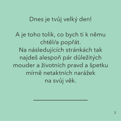 Tahle knížka je sice rozměrově menší, zato obsahově předčí kdejaký román z edice Večery pod lampou. 56 celobarevných stran v sobě střídá humor a československou nostalgii, které vás ani oslavence z generace tzv. Baby Boomers nepřestanou bavit. Zkrátka jedna velká narozeninová oslava v duchu Jiřího Suchého, tesilek a foglarovek!