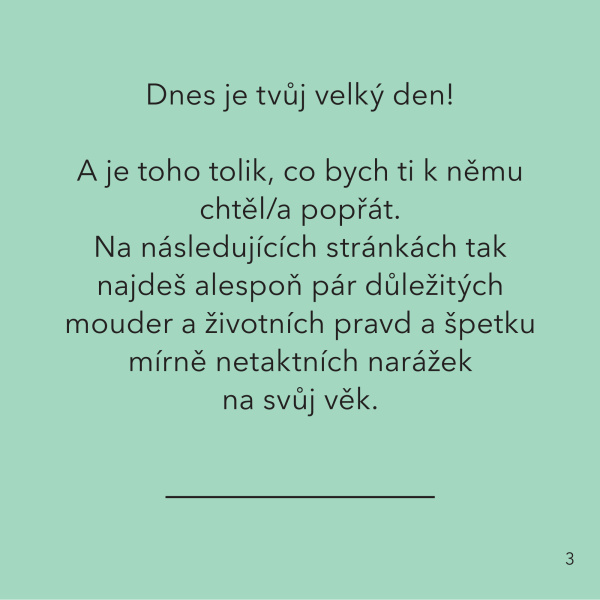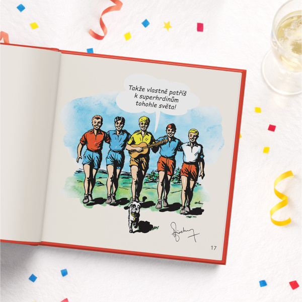 Tahle knížka je sice rozměrově menší, zato obsahově předčí kdejaký román z edice Večery pod lampou. 56 celobarevných stran v sobě střídá humor a československou nostalgii, které vás ani oslavence z generace tzv. Baby Boomers nepřestanou bavit. Zkrátka jedna velká narozeninová oslava v duchu Jiřího Suchého, tesilek a foglarovek!