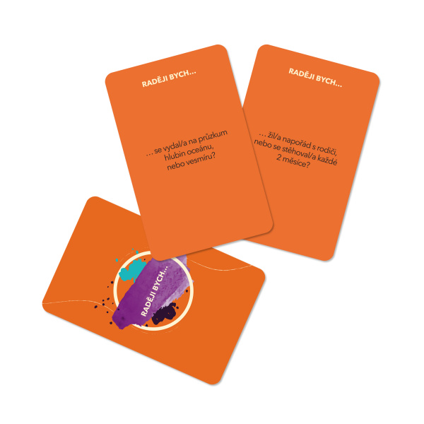 Věřte, že tyhle karty si jen tak neohrajete. Hra Na párty obsahuje 180 unikátních otázek rozdělených do 5 kategorií – Raději bych..., Do hloubky, Pravda, nebo úkol?, Kdo by spíš..., Žhavé. Jednotlivé kategorie vás provedou od lehčích otázek až po ty, u kterých se pořádně zapotíte. Pobavíte se o svých názorech, zkušenostech i vztazích a chybět nebudou ani pikantnosti. Takže karty do ruky, stud stranou a párty může začít!