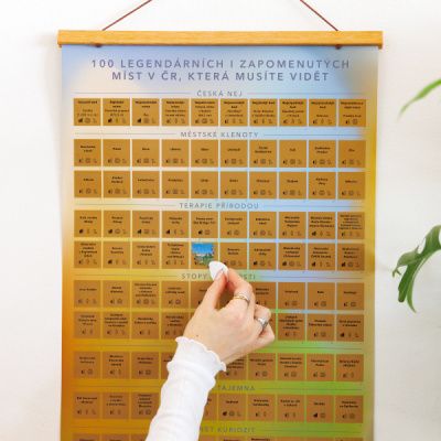 Plakát obsahuje hned 100 originálních cestovatelských tipů, rozdělených do sedmi tematických kategorií – česká nej, městské klenoty, terapie přírodou, stopy minulosti, kulturní vzpruha, nádech tajemna a kabinet kuriozit. Díky nim navštívíte celou řadu neobvyklých míst, o kterých (už) se příliš nemluví nebo by vás jen tak nenapadly. Na každém políčku pak na vás čekají také piktogramy (obtížnost a počet lidí), které zajistí, abyste si cílovou destinaci vybrali podle své aktuální nálady či fyzické kondice. Pro pejskaře je navíc doplněno info, zda na místo mohou i jejich chlupáči.